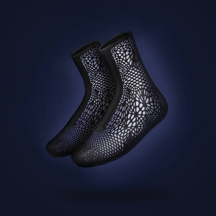 Leedoff Studio 为 SOLS 设计的一款概念靴子 ADAPTIV采用 3D打印技术实现了完全自动化的定制,并能根据用户的穿着情况和实时动作,利用传感器和气囊进行自适应调节。靴子外壳通过3D打印一体成形,尼龙网状造在脚踝和脚趾处加强了弹性以便穿着者灵活运动,而在脚尖处则进行了加厚加固。尼龙网内埋有导线,它们与位于鞋舌处的传感器相连,可以感知靴子各处的松紧和压力状况并自动加以调节。
