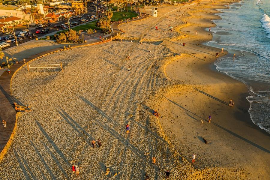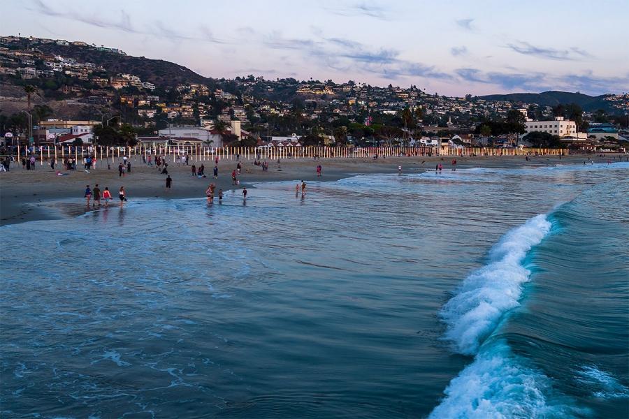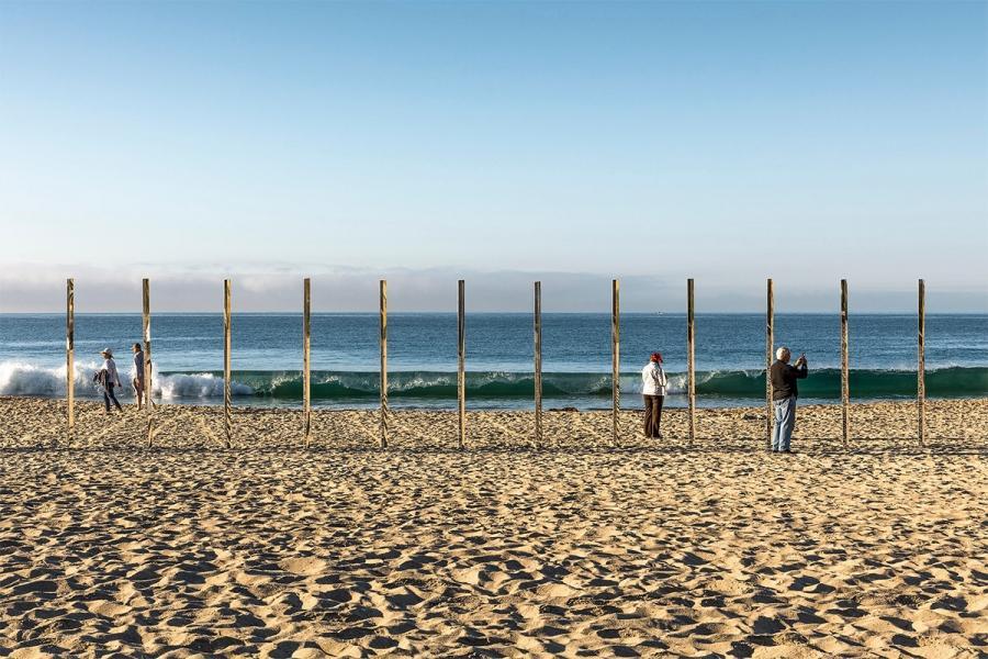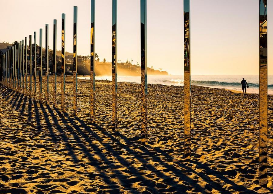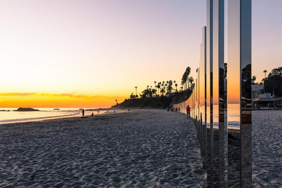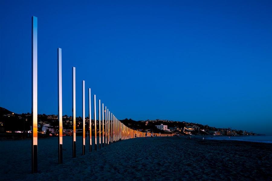由美国艺术家菲利浦史密斯III最新户外安装是一个华丽的线镜像极点拉伸1/4英里到拉古纳比奇。镜像雕塑反映了潮汐变化的自然美。