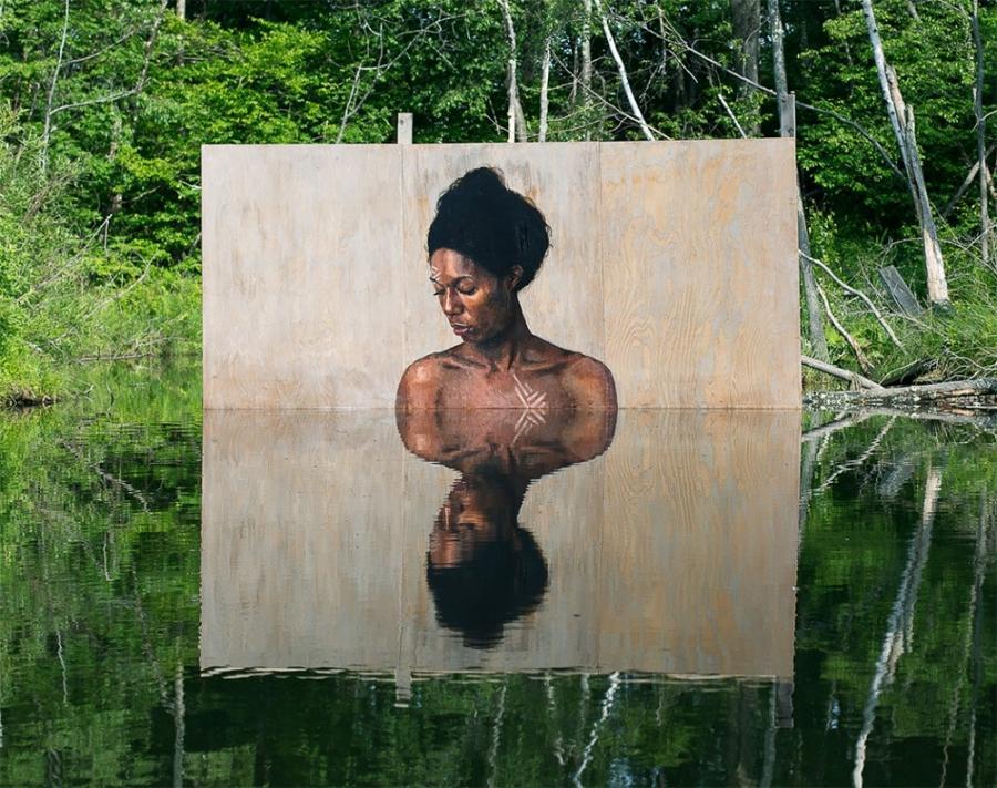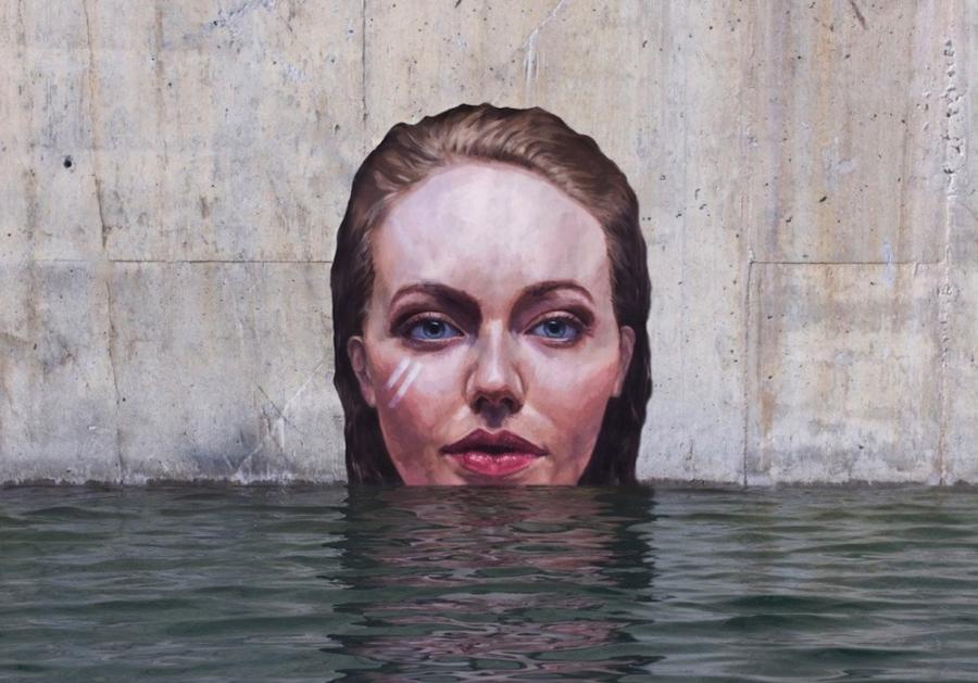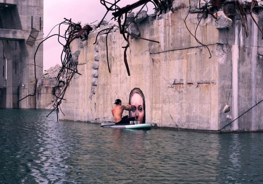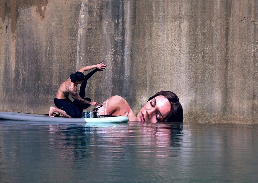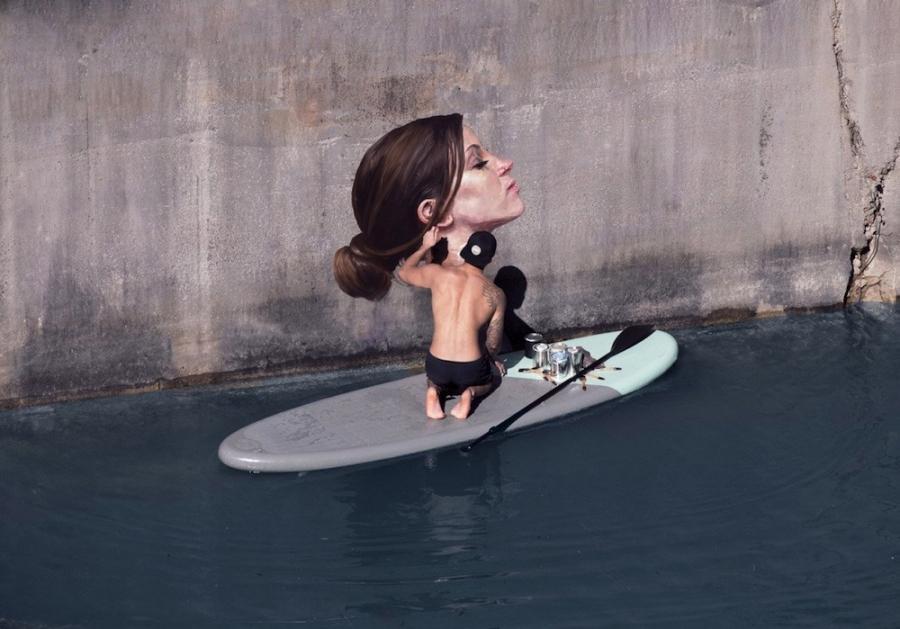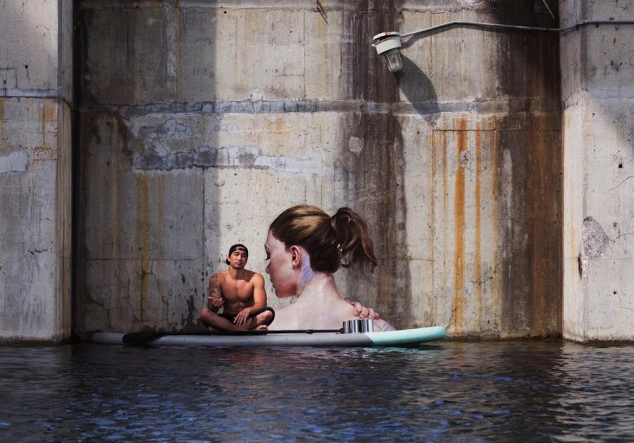 独特的街头艺术创作的Sean Yoro,又名草裙舞,一位纽约艺术家谁喜欢工作而划走在他的冲浪板。